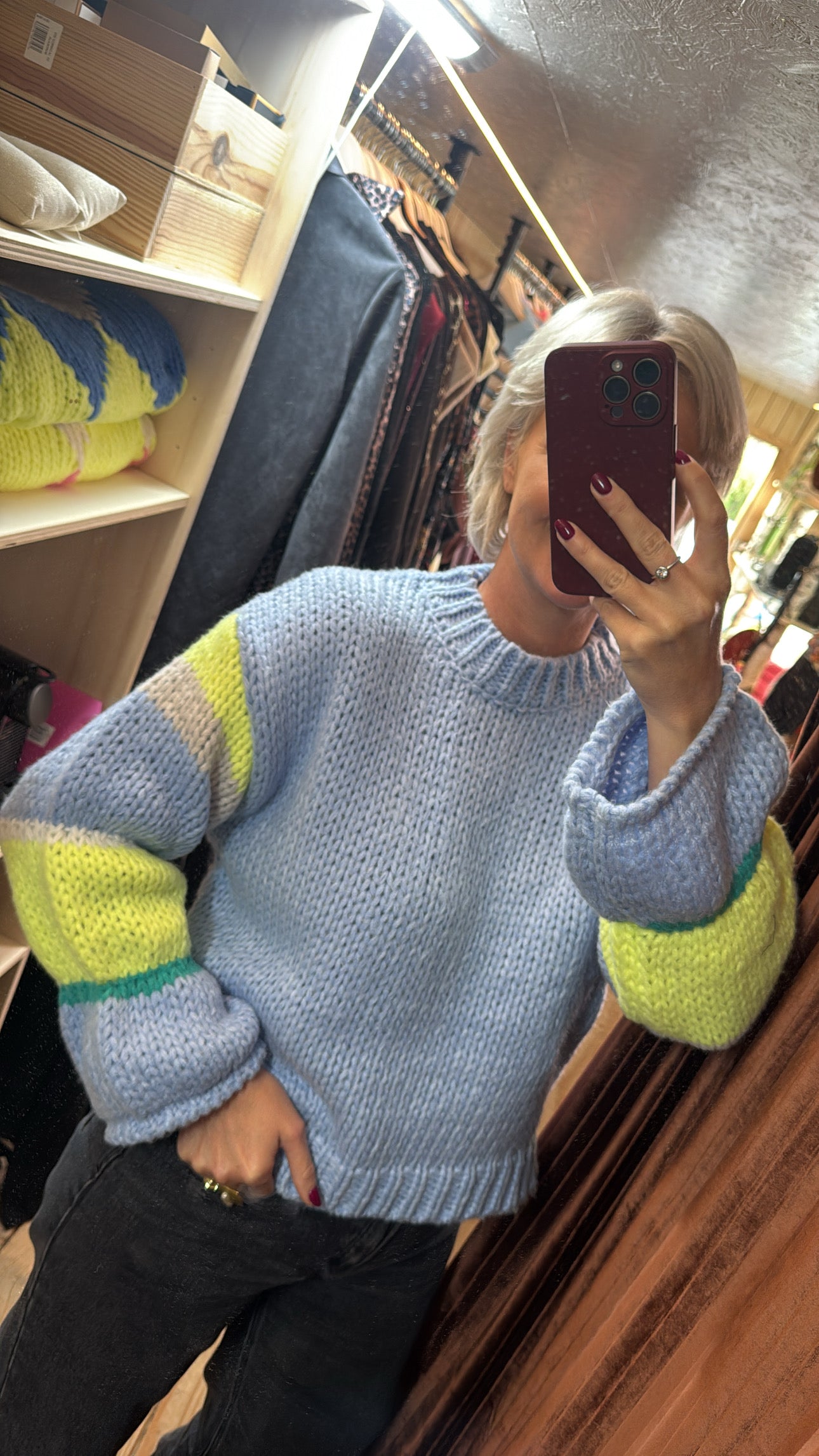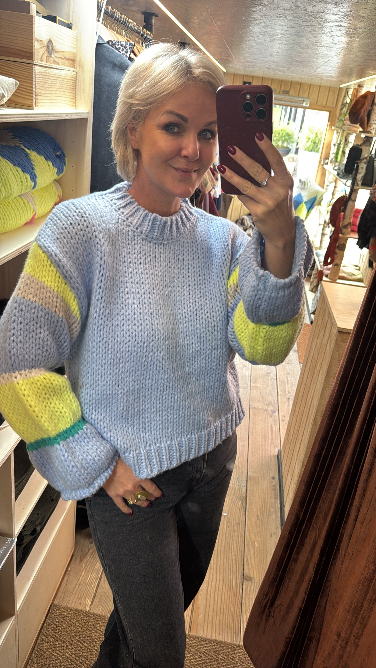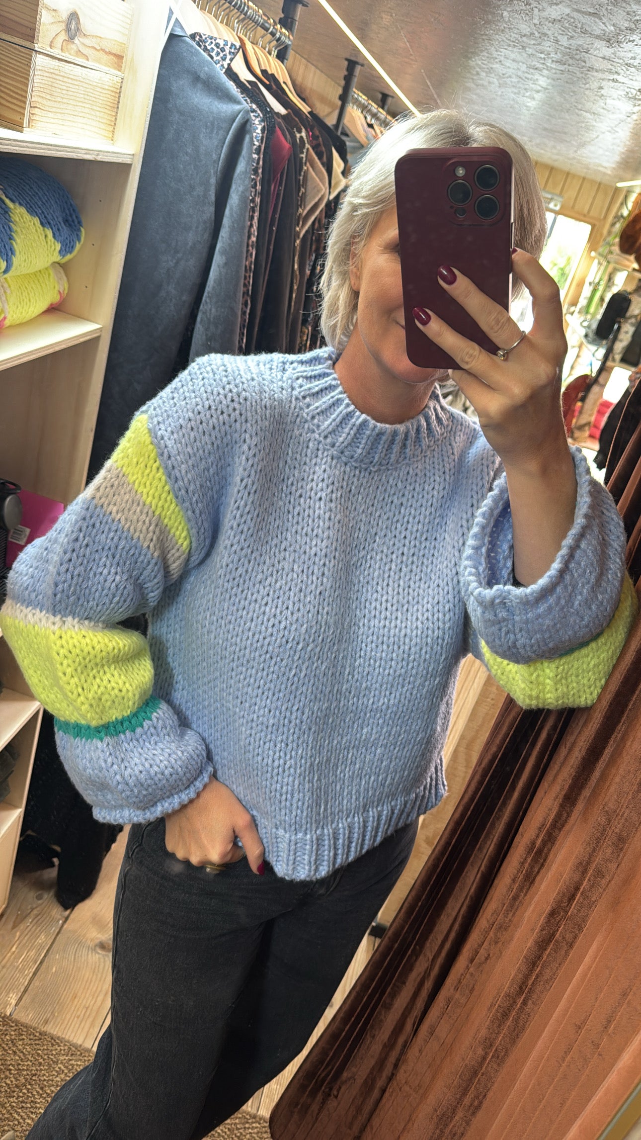 Onze superzachte one size trui met speelse strepen op de mouwen. Luchtig, cosy en ideaal om elke outfit een frisse touch te geven.